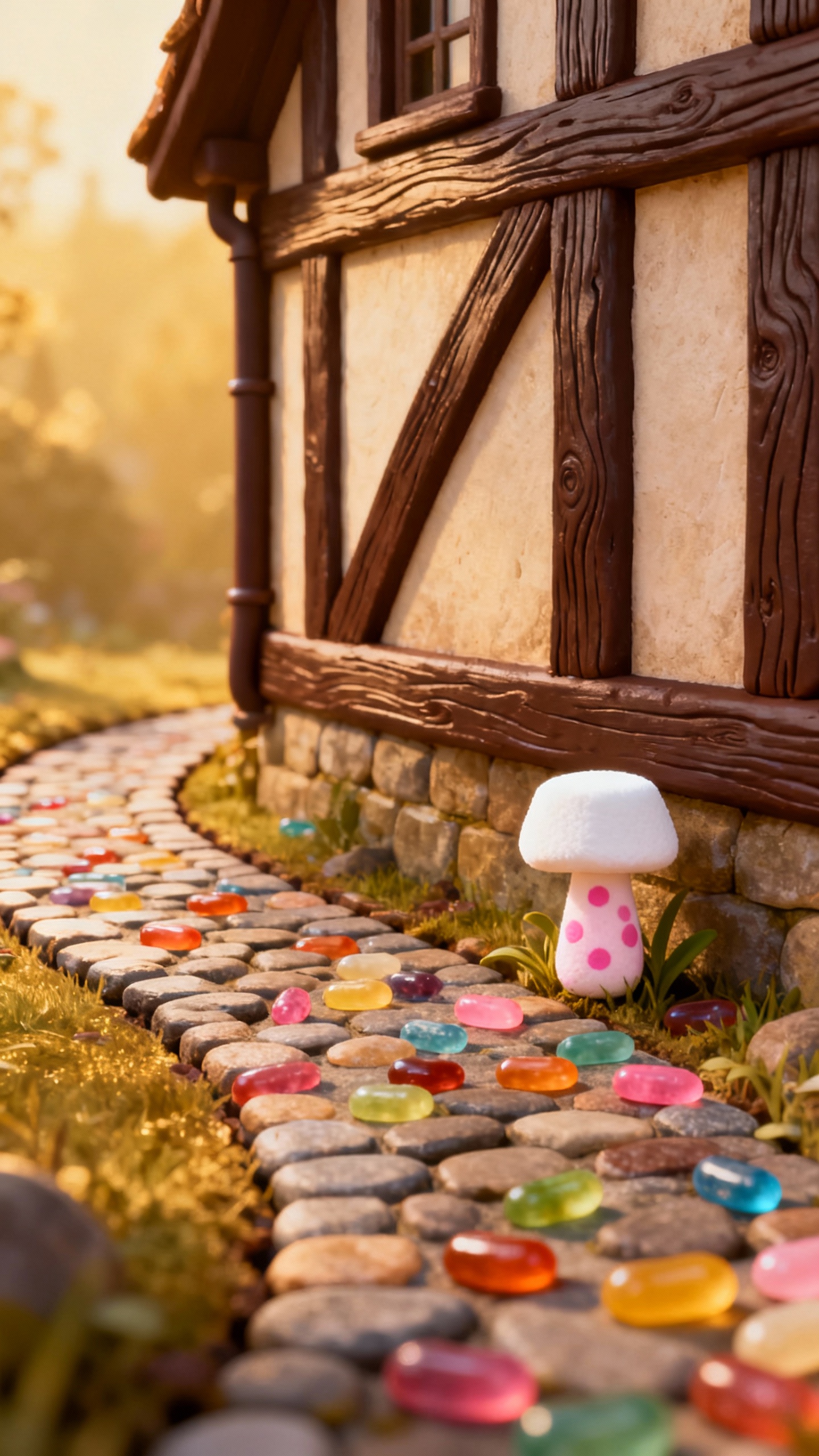 A sagging roofline, a crooked chimney, and a path of candy “stones” create instant storybook vibes.