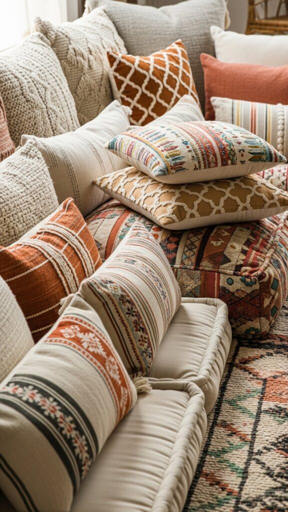 Now throw all your fluffy, decorative pillows on top. These are your comfort pillows—the ones you’ll actually use for sleeping or cuddling during movie marathons. Mix sizes and textures. Velvet with faux fur? Chef’s kiss.