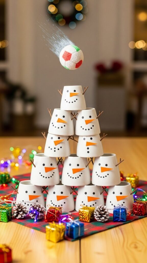 2. Players take turns throwing soft balls or beanbags to knock down as many snowmen as possible.