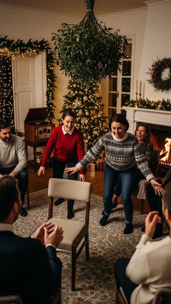 5. The player left standing must pick a mistletoe-decorated chair and perform a fun task, like giving a holiday hug.