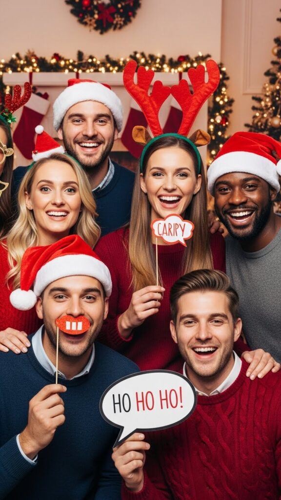 • Props like Santa hats, reindeer antlers, ugly sweaters, and holiday signs