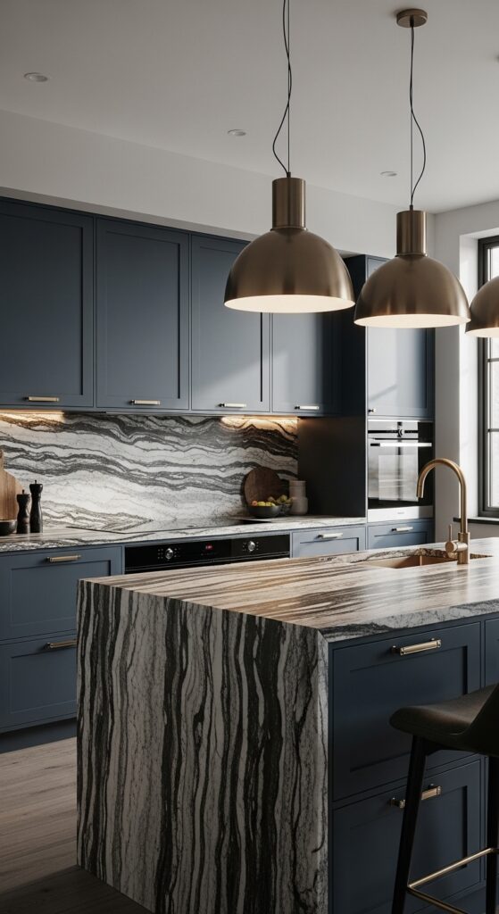 And I don’t mean simple white quartz. Nope — high-contrast stone with loud veining is taking the spotlight.