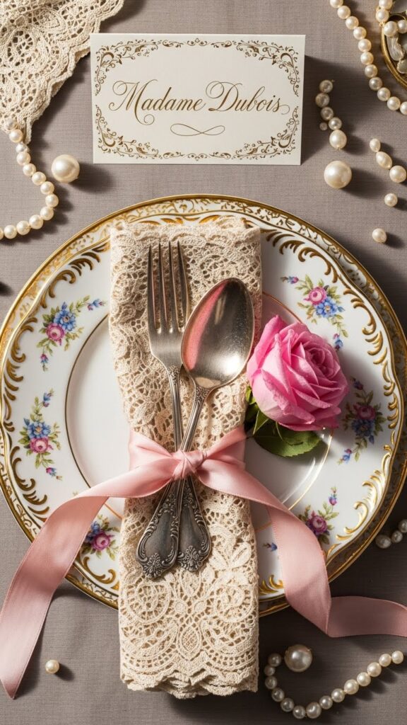 Don’t just decorate the table—create little decorated corners throughout your space. A vintage chair with a lace throw and flowers. A side table with framed portraits and perfume bottles. These photo opportunities make your party feel immersive.