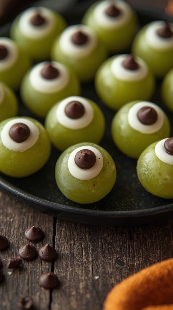 Here’s how you do it: Wash your grapes and pat them dry. Melt the white chocolate chips (microwave works fine—30 seconds at a time, stir between). Dip the bottom of each white chocolate chip in the melted chocolate and stick it on a grape. Before it sets, add a mini chocolate chip in the center as the “pupil.”