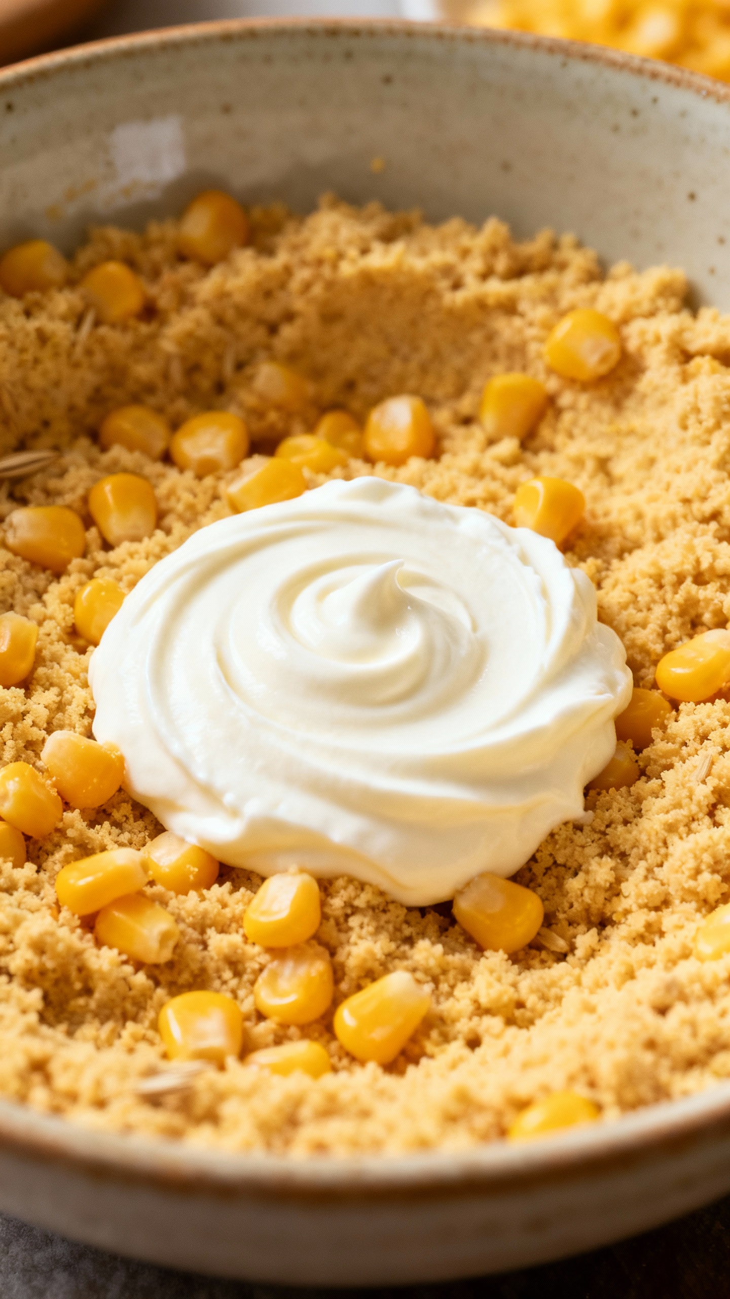 - In a large bowl, stir together creamed corn, whole corn, sour cream, and melted butter.