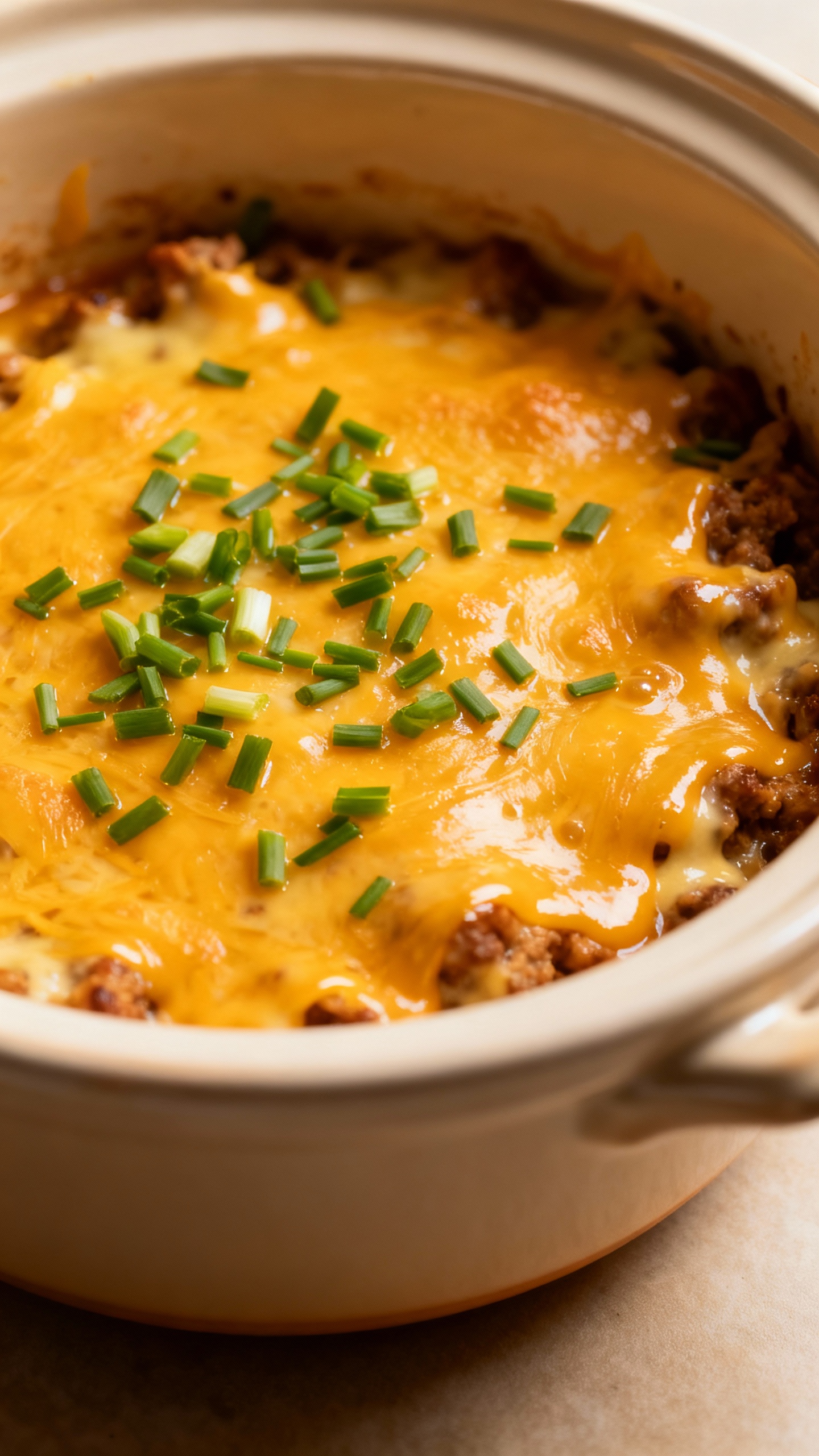 - Pour into the slow cooker and smooth the top. Add cheese on top if you’re into it.