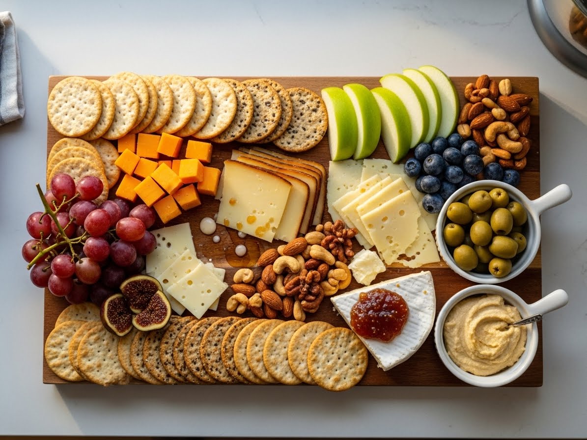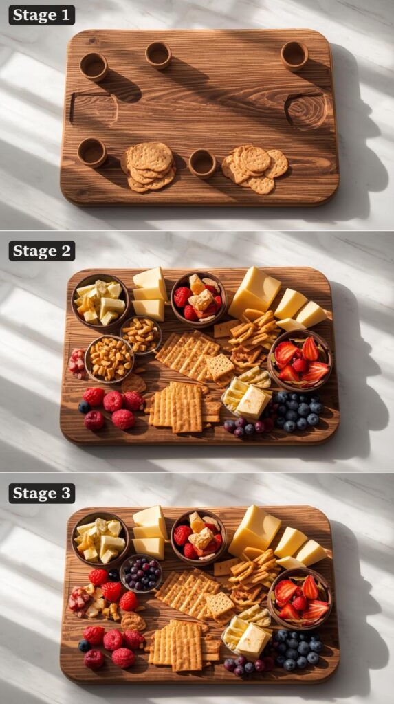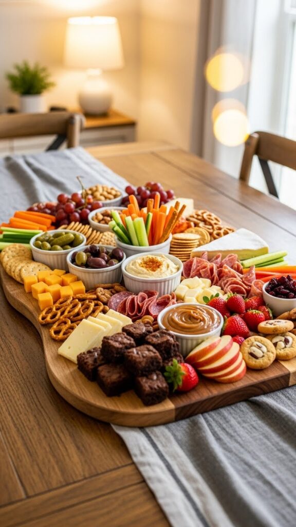 I start with the biggest items first, then fill in the gaps with smaller snacks. That’s genuinely it. You’re not styling a magazine shoot—you’re feeding people who are about to get hangry.