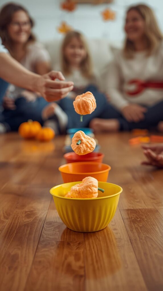 Here’s the setup: Grab bags of marshmallow pumpkins or candy corn. Place bowls at different distances, and let everyone take turns tossing. Start easy with close bowls, then gradually move them farther away. The real fun starts when you add the “extreme mode”—someone holds a bowl on their head or (if you’re brave) opens their mouth to catch them.
