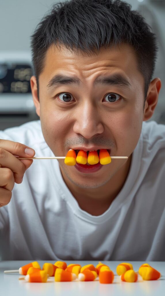Everyone gets a popsicle stick to hold in their mouth. The challenge? Balance as many pieces of candy corn on that stick as possible within 60 seconds. No hands allowed after the timer starts. Just you, gravity, and your questionable balancing skills.