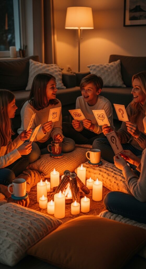 Create a cozy setup—real fire pit, fake electric campfire, or even just flameless candles arranged in a circle. Everyone takes turns drawing question cards and answering. Mix silly questions with thoughtful ones for a perfect balance.