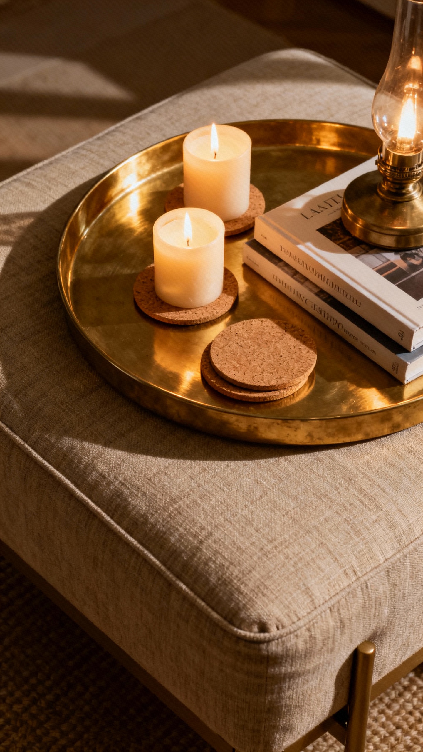 • Tray it up: Use a tray to corral remotes, coasters, and a candle so the surface stays tidy.