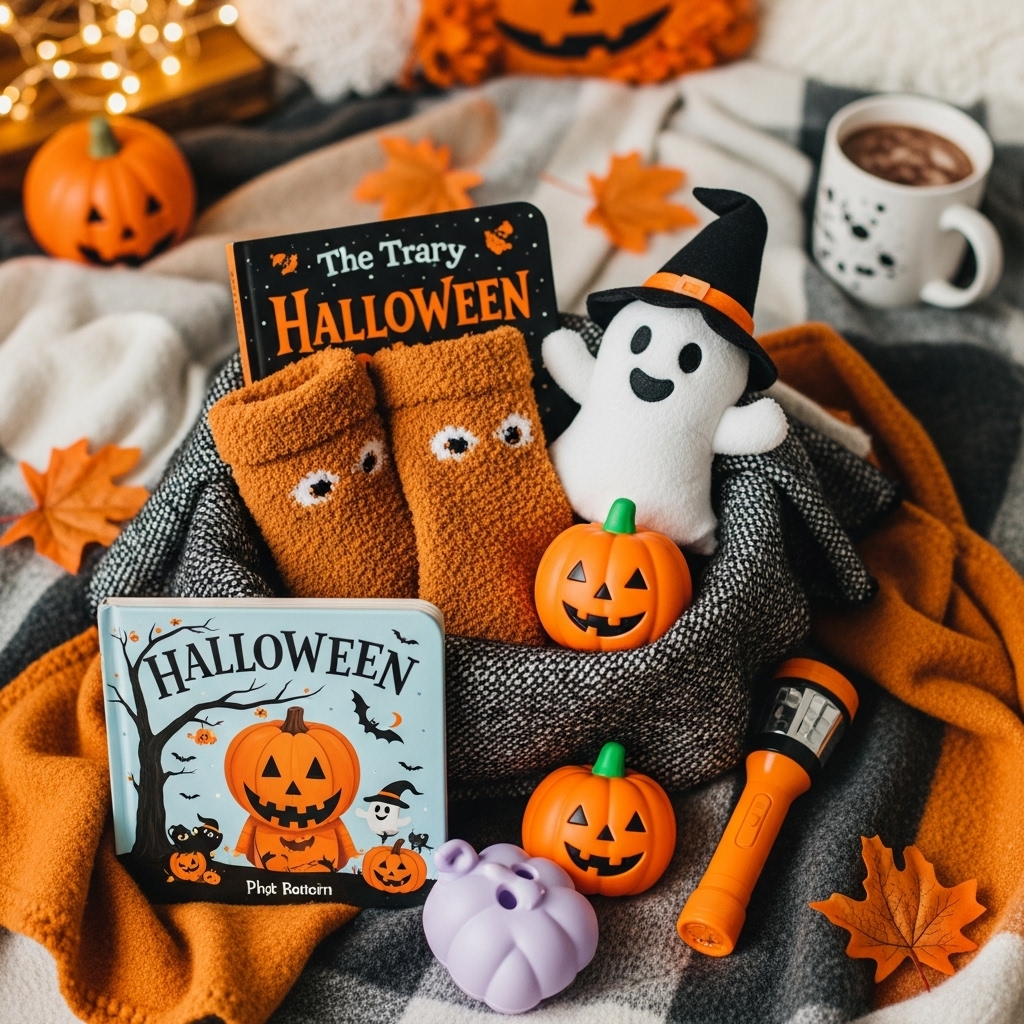 Choose smiling pumpkins, friendly ghosts, bright colors, and soft textures. Avoid masks, jump-scare toys, or intense sound effects.